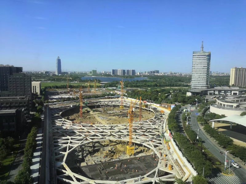 项目基坑开挖面积约23000㎡,开挖深度10.2~10.8m,水位降深约11.00m。开挖深度范围内淤泥层较厚,周边环境复杂,基坑变形控制要求高。经过经济和技术方面的对比,采用SMW(Soil Mixing Wall)工法桩+钢筋混凝土内支撑(环撑)+坑内管井降水的支护体系。SMW工法桩具有防渗隔水的作用,施工速度快,工艺简单,对环境的污染小,型钢可回收。环撑的布置形式,既能完全发挥砼支撑的抗压性能,又能给基坑较大的施工空间。